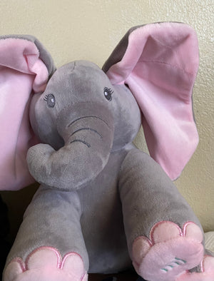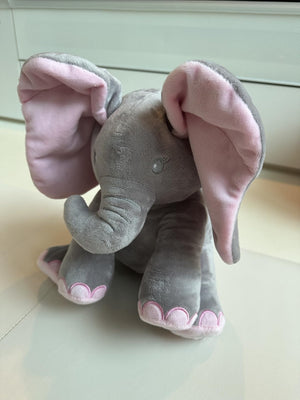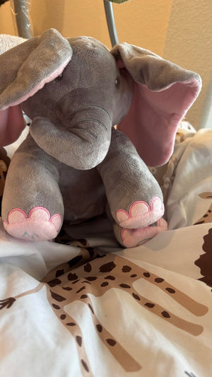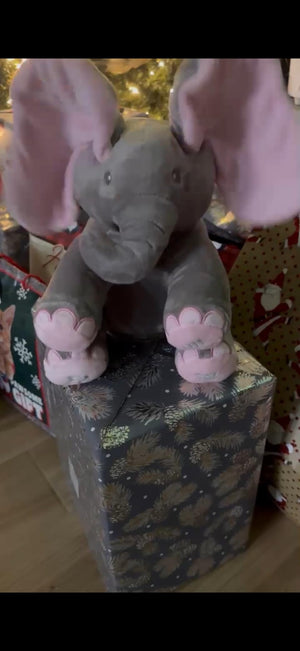 Urechile se mișcă în timp ce elefantul cântă, captând atenția copilului și oferindu-i o experiență interactivă.